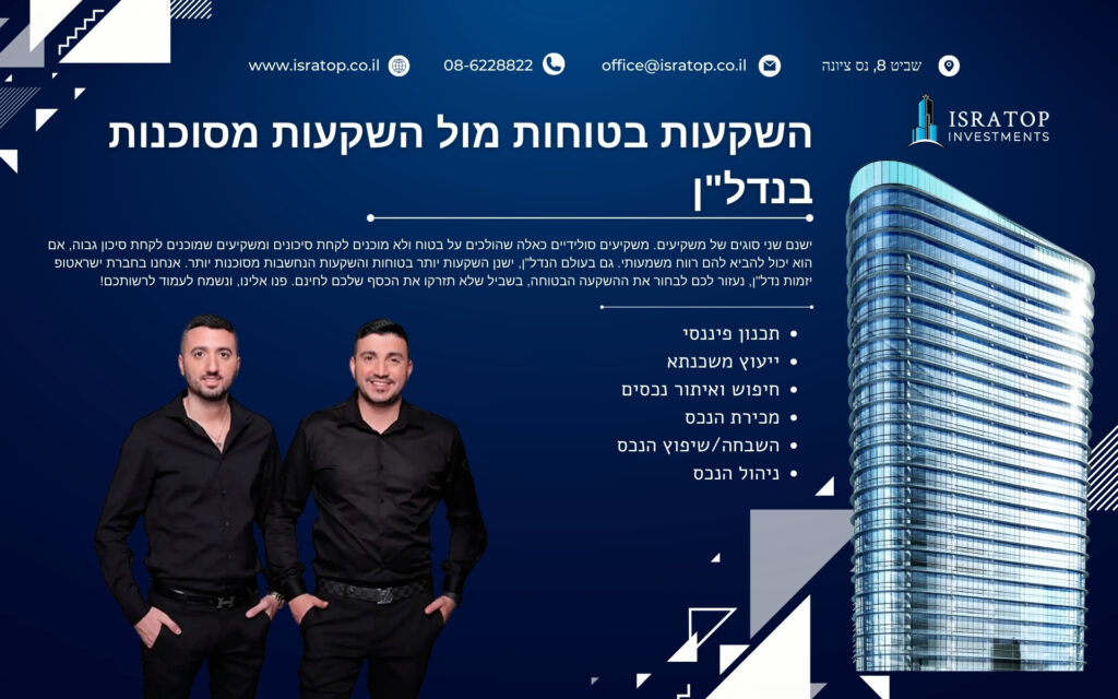 אם אתם מחפשים השקעות בטוחות, זה הזמן ליצור איתנו קשר. חברת ישראטופ יזמות נדל"ן מתמחה בתחום ומספקת לכם את כל הכלים והמידע הרלוונטי בנושא. אל תהססו, פנו אלינו עוד היום!